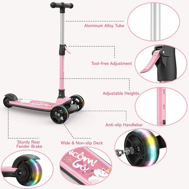 - Super Cool Flashin LED PU Wheels - The toddler scooter features two big fronts LED wheels and small rear LED wheels, which are motion activated with no batteries required. Lights get brighter the faster your kids go. The bright and eye-catching design keeps children safe and fun in the dark. Highly sensitive rear brake, stop when stepped on.